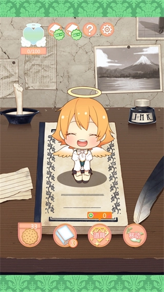 2、于主页能够瞧见一个极为可爱且萌态十足的天使宝宝,其下方设有饼干按键、图书按键、道具按键以及移动按钮。