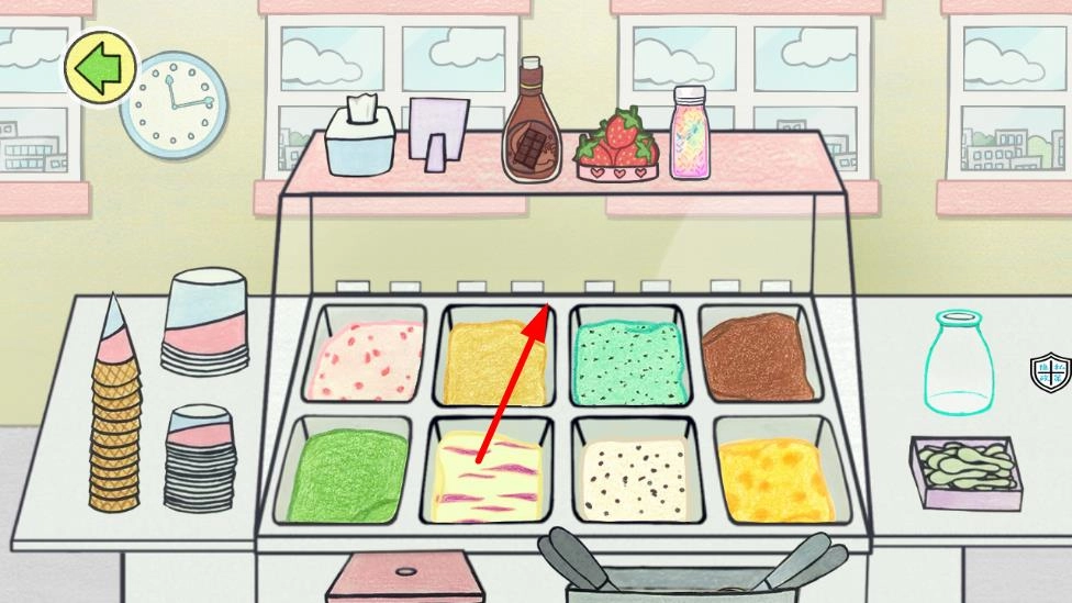2、当顾客来到店铺门前下单后,依据其需求在操作台上挑选诸如奶油、水果、巧克力之类的相应原料,依照步骤完成雪糕的制作,随后递交给顾客以获取金币。