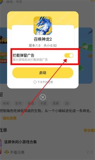 1、安装闪玩后点击启动小游戏,此时会出现“拦截弹窗广告”这一选项,将其打开就能拦截游戏弹窗广告。