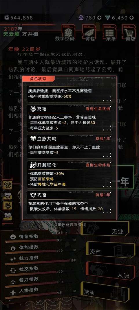 注:若没有安装肝脏辅助装置时多次使用,会有一定概率获得副作用‘肝脏衰竭’会导致人物在下一年直接死亡