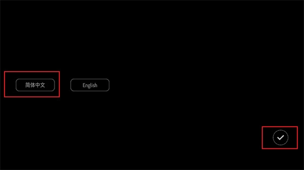 1、玩家进入游戏场景后,首先要进行语言选择,可点击【简体中文】按钮,接着点击屏幕右下角的【√】号。