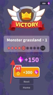 1、战斗胜利后,在结算界面领取“Monstergrassland·1”及钻石奖励,点击“Next”开启新关卡。