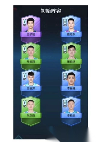 初始阵容配备1张紫色卡牌、2至4张蓝色卡牌以及6至3张绿色卡牌。鉴于游戏中存在无限置换机制,且这三种等阶的卡牌获取难度较低,因此无需关注球员具体位置,尽力组建1紫、4蓝、3绿的阵容即可。