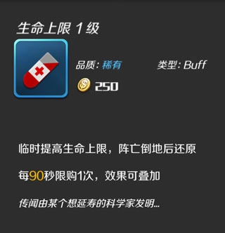 效果:暂时提升生命上限,角色阵亡倒地后恢复至原生命上限。初始等级状态下,每90秒仅能购买1次,此效果能够叠加。