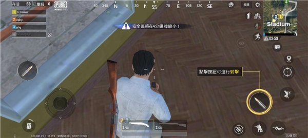 4、右上角设有小地图,玩家可依据地图标识来探寻方向。下方的倒计时为缩圈倒计时,玩家需点击地图查看安全区并尽快抵达;
