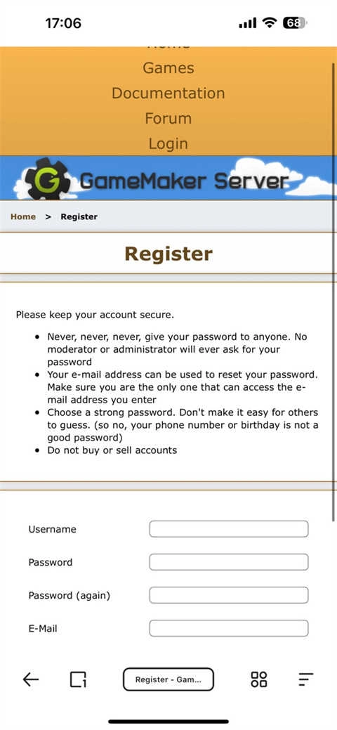 3、按照提示,在浏览器地址栏输入网址:gamemakerserver.com/en/register ,进而访问注册页面。