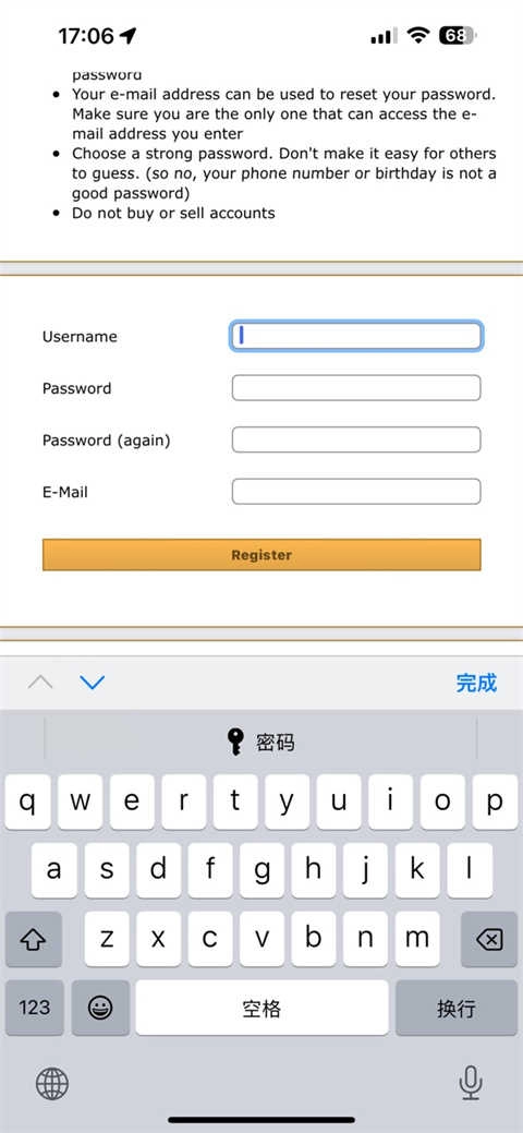 5、依照要求,依次填写用户名、密码、确认密码以及邮箱地址(邮箱可自行随意填写)。填写完毕后,点击下方的“注册”按钮。若显示绿色,即表明注册成功;若显示红色,则意味着注册失败。若注册失败,请再次尝试上述步骤。