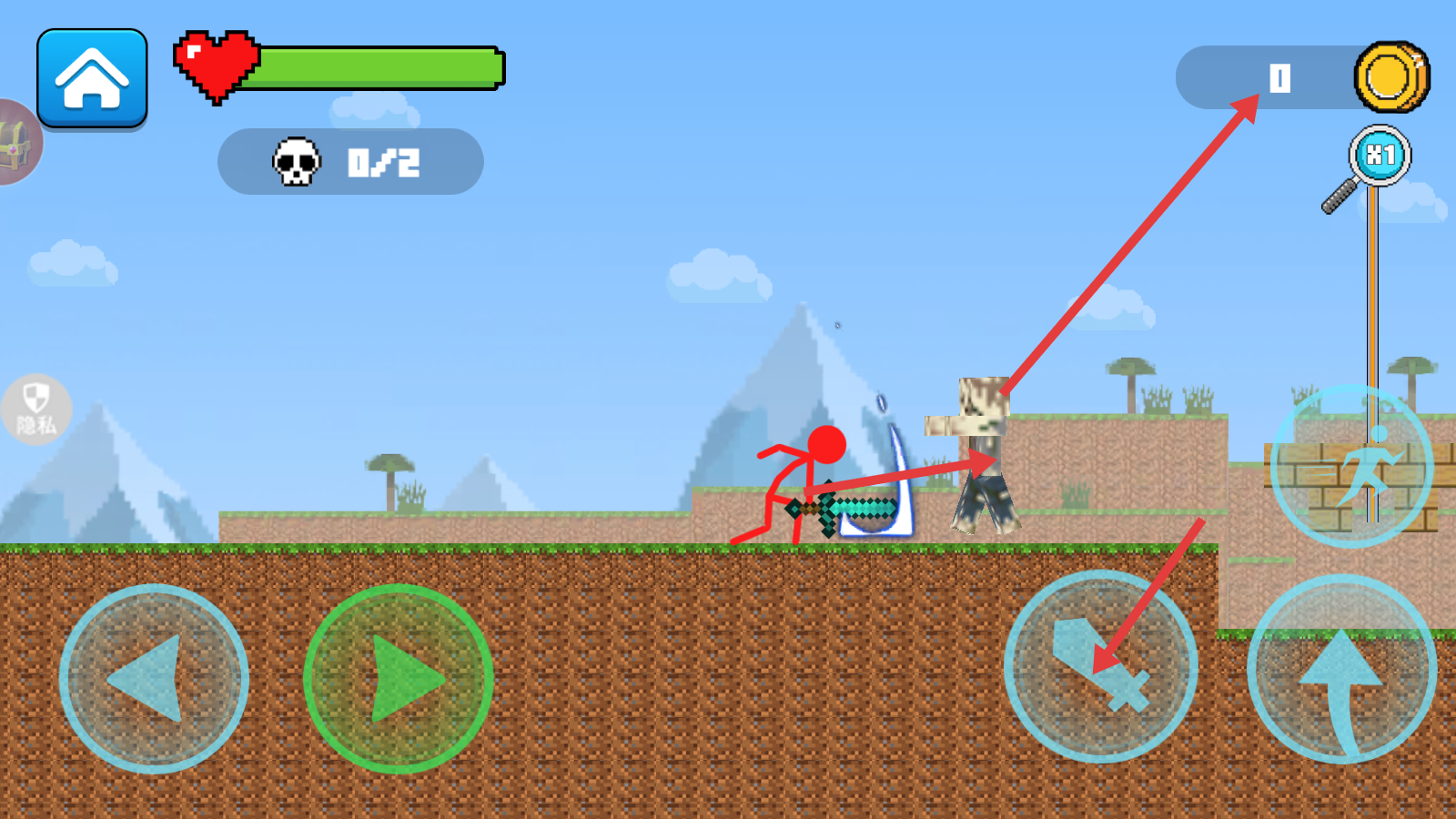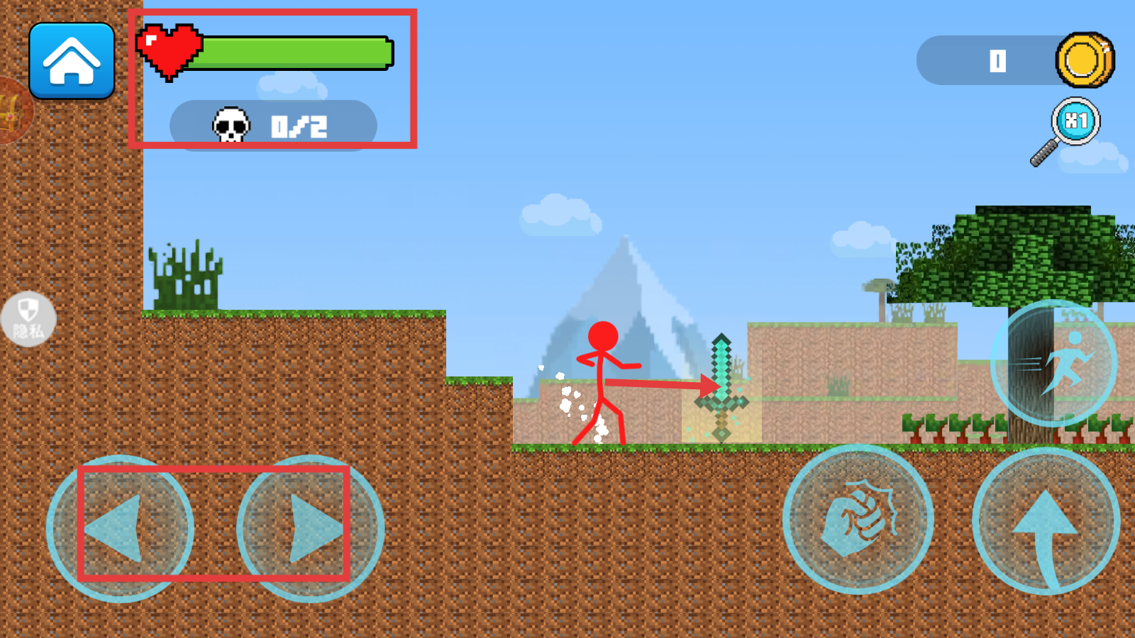 2、通过操控左侧的左右方向键来移动角色,同时留意上方的生命值以及【0/2】敌人计数,在关卡里灵活地走位并展开探索。