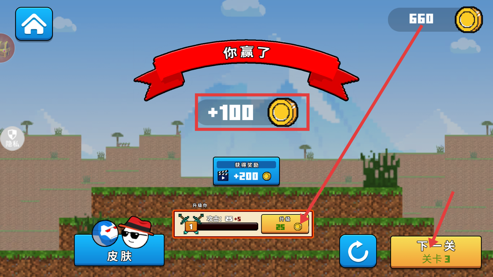 4、成功通关后可领取【+100】金币,这些金币能够用来升级攻击属性。完成升级后,点击【下一关 - 关卡3】,即可继续挑战新的关卡。