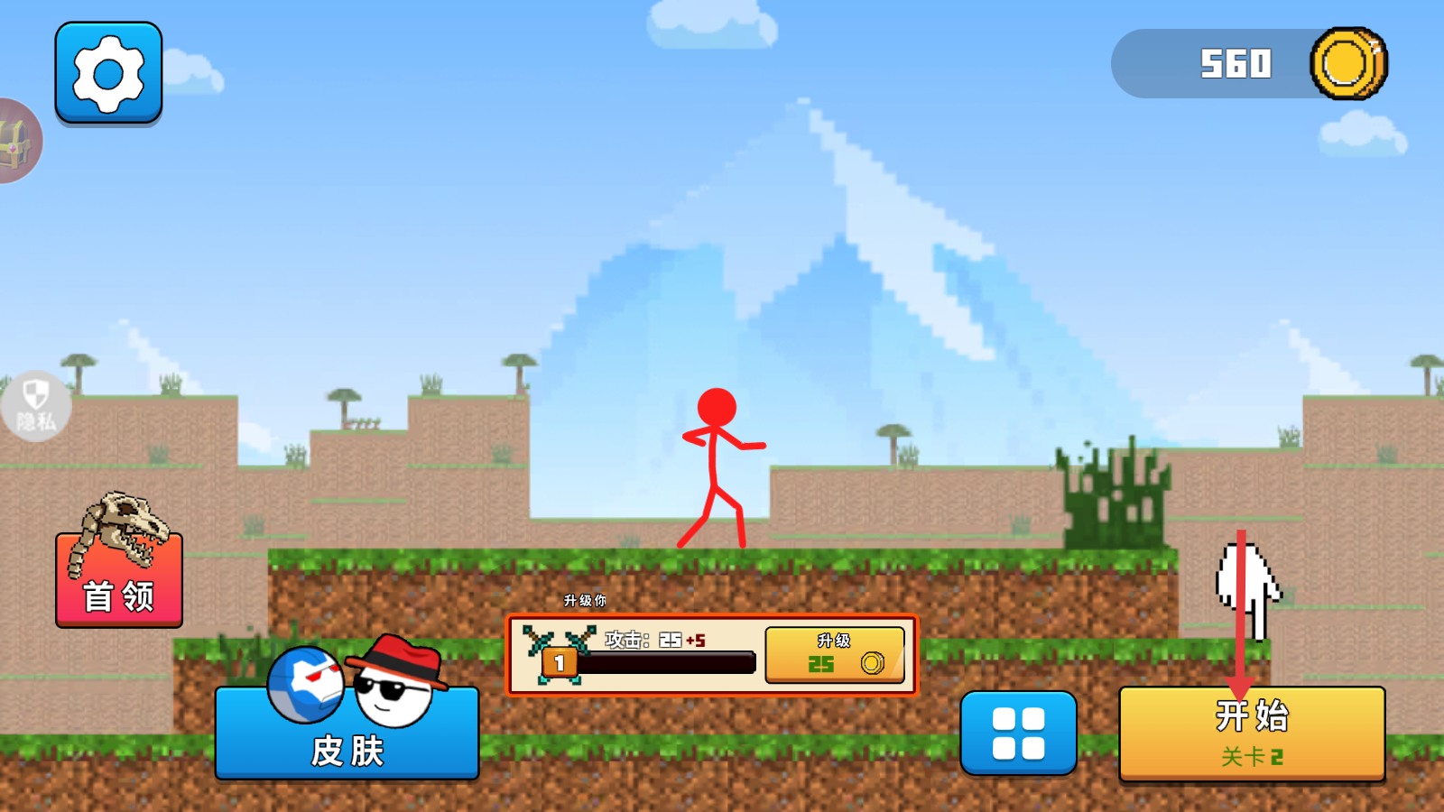 1. 点击【开始 - 关卡2】即可进入游戏,花费25金币能够对【攻击 - 25 + 5】进行升级,升级提升战斗能力后便可开启关卡。