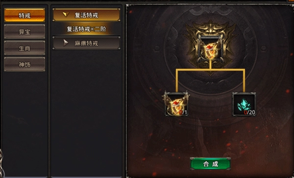说明:可通过游戏右下方的“合成”入口进入合成系统。该合成系统初始仅包含四个部分,分别为特戒、异宝、生肖以及神饰。
