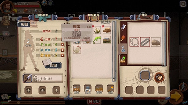 (有几个伸手可及的资源往往被玩家错过,一是随风滚动的草团,连续点击可获得枯草,二是身边嗡嗡环绕的苍蝇,鼠标点中直接空手抓昆虫) 【物品合成】 拾荒或者乞讨得来的物品除了直接使用外,多数都可以参与合成。比如可以将肉烹调成烤肉,石子压制成石块,刀片做成厨刀等等。在物品栏右侧便可查看当前可以合成的物品及配方,建议玩家对配方心中有数,随时了解手头可以合成的物品,这对于生存来说至关重要。 初期玩家合成的内容非常之少,这可以通过升级厨具和车间进行提升。升级厨具能增加烹调食物的种类,升级车间则可以增加武器零件配方。