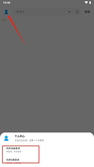 1. 打开软件,点击左上角位置进入个人中心,在页面下方能够看到同步网易歌单与Q音歌单的选项。