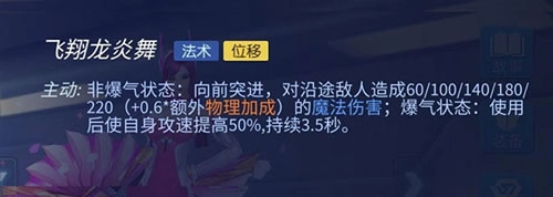 三技能名为飞翔龙炎舞,属于位移技能。在爆气状态下使用该技能,相比非爆气状态,能额外提升自身攻击速度,持续3.5秒。