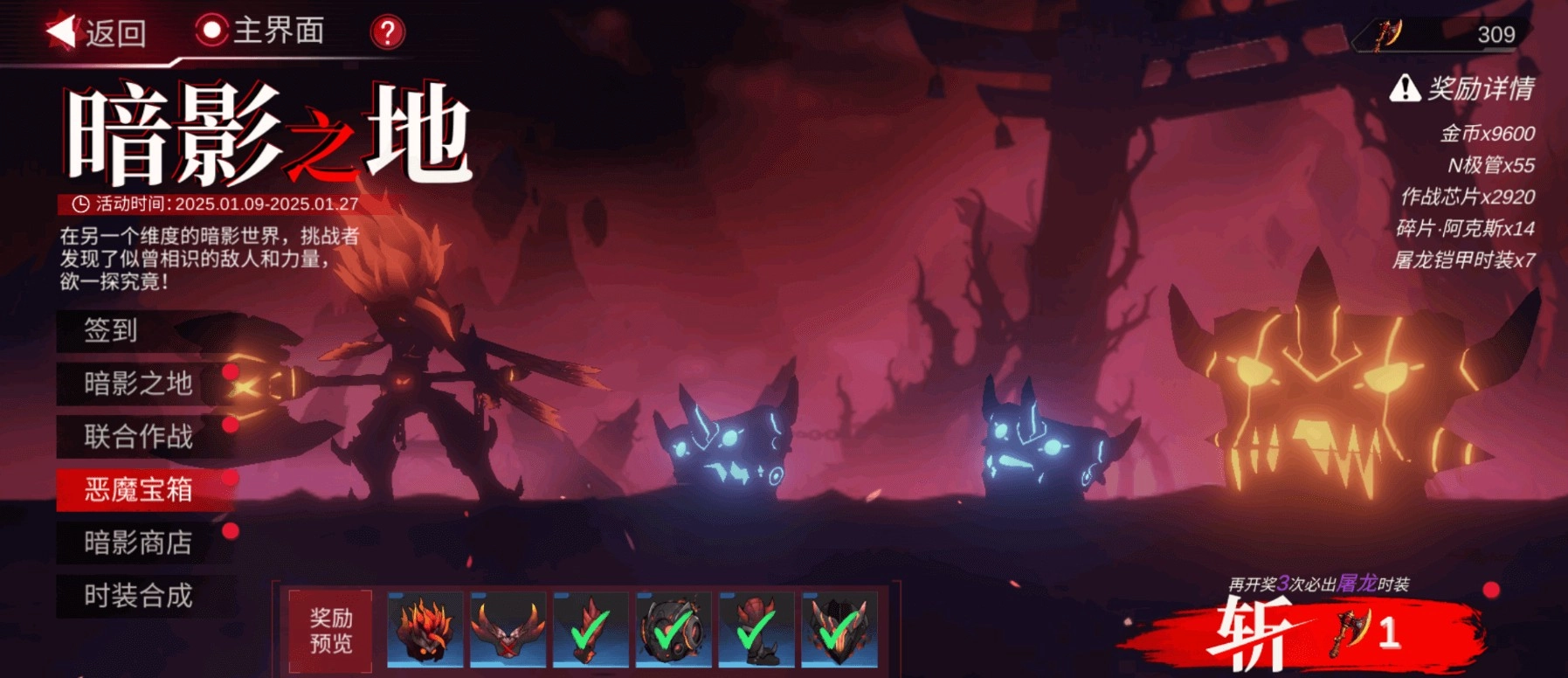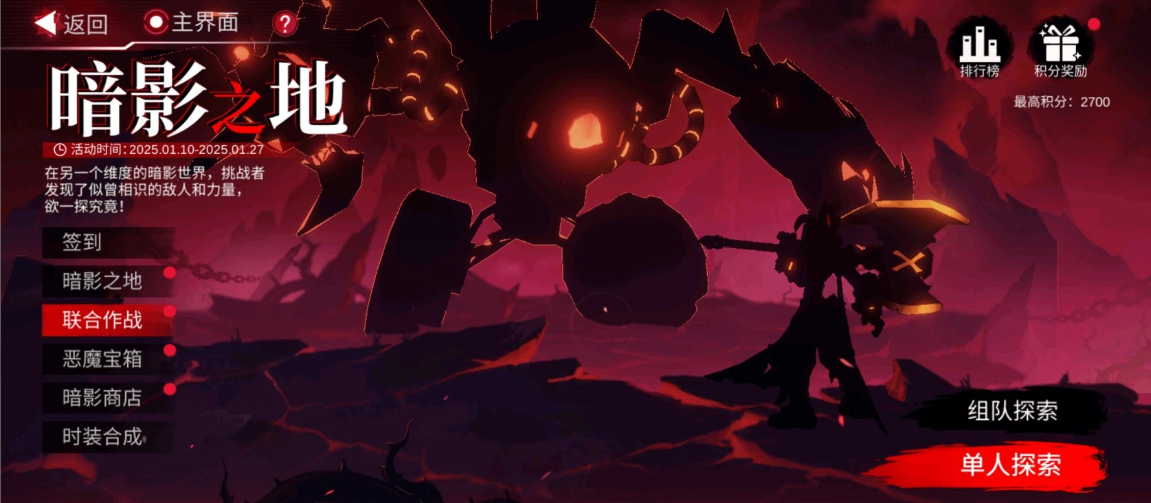 热血与激情的极致碰撞!于暗影之地的世界中,你将携手小伙伴并肩作战,一同领略无与伦比的战斗快感。每一回技能的精确释放,每一次连招的默契配合,都能让你们体会到拳拳到肉的震撼打击。尽情展现你们的格斗技巧,一路勇往直前地闯关。每次挑战完毕,挑战者们均会获取相应的挑战分数,达到对应的分数便可领取积分奖励!