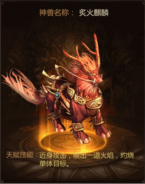 形态描述:能够召唤出炙火麒麟,该麒麟可通过口吐炙火对敌人进行远程攻击。