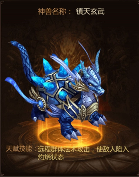 形态描述:能够召唤出上古神兽镇天玄武,此神兽具备极高的物理防御能力,血量厚实,会以扇形范围对前方的敌人发动攻击。