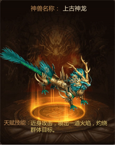 形态描述:能够召唤上古神龙,发动远程攻击,以群体扇形的方式对前方敌人展开攻击。