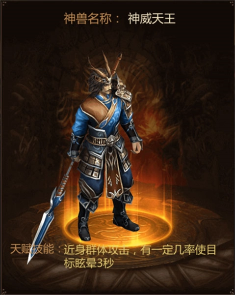 形态描述:能够召唤出神威天王,以远程的方式发动攻击,对前方敌人施展群体扇形攻击。