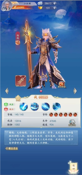 杨戬,乃是民间信仰与道教共同尊崇的神祇角色。他拥有超乎常人的力量,其能力变幻无穷,还精通七十二变(亦即八九玄功)。杨戬手持三尖两刃枪,武艺高超绝伦,座下陪伴着神兽哮天犬,额头中间更是长有第三只神眼。