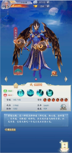 这是一种拥有五种神通(神足通、他心通、宿命通、天耳通、天眼通)的神鸟,自出生便具备翱翔的能力。它以龙为食,每日需进食一位龙王以及五百条小龙。