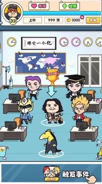 《我们这班打工仔》是一款模拟职场生存的休闲小游戏。在游戏里,玩家能够体验从实习生一路成长为社会精英,甚至成为秃头老板的职场生活。游戏提供了多种角色供玩家挑选,每个角色都有独特的体质、不同的技能,还有与人物绑定的特殊事件。随着时间流逝,玩家会经历形形色色的事件,而且每一次选择都会使人物属性发生变化。这些变化积少成多,量变终将引发质变。不过,玩家的目标始终只有一个,那就是顺利通过最终考核。