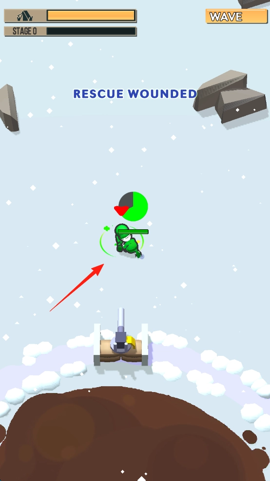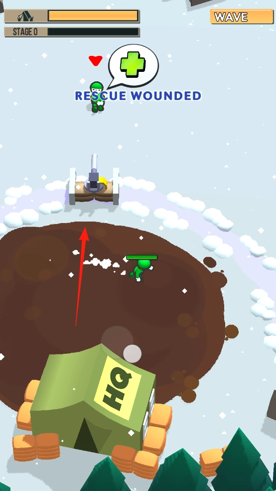 在被红箭头标记的积雪环境中,控制绿色士兵角色,移动至标有“RESCUEWOUNDED”的区域,完成对受伤人员的救援任务。