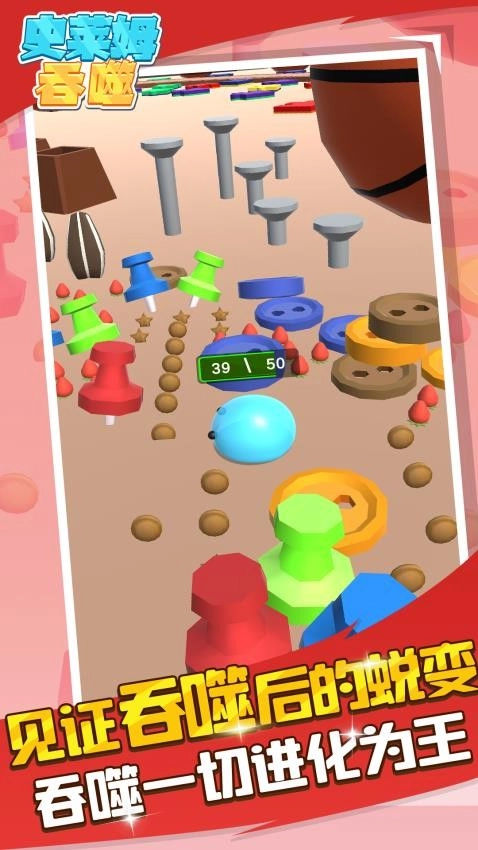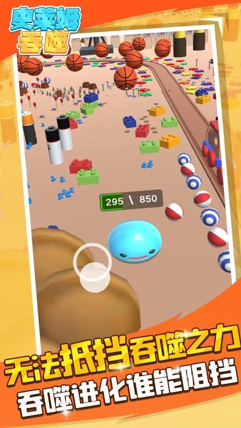 用手指在屏幕上滑动,引导史莱姆移动并让它吞噬比自己体型小的物体。