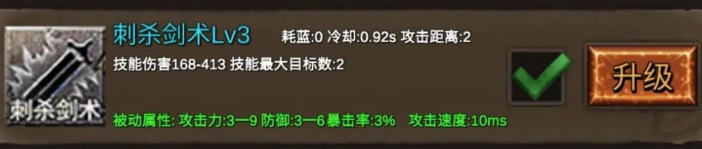 刺杀技能能同时攻击两个目标,伤害输出相当可观,其被动效果在攻击、防御和暴击方面的加成十分全面,而且冷却时间较短,是前中期实用性很强的技能。即便到了后期需要替换,也无需担心升级的问题,因为升级同样能够强化它的被动属性。