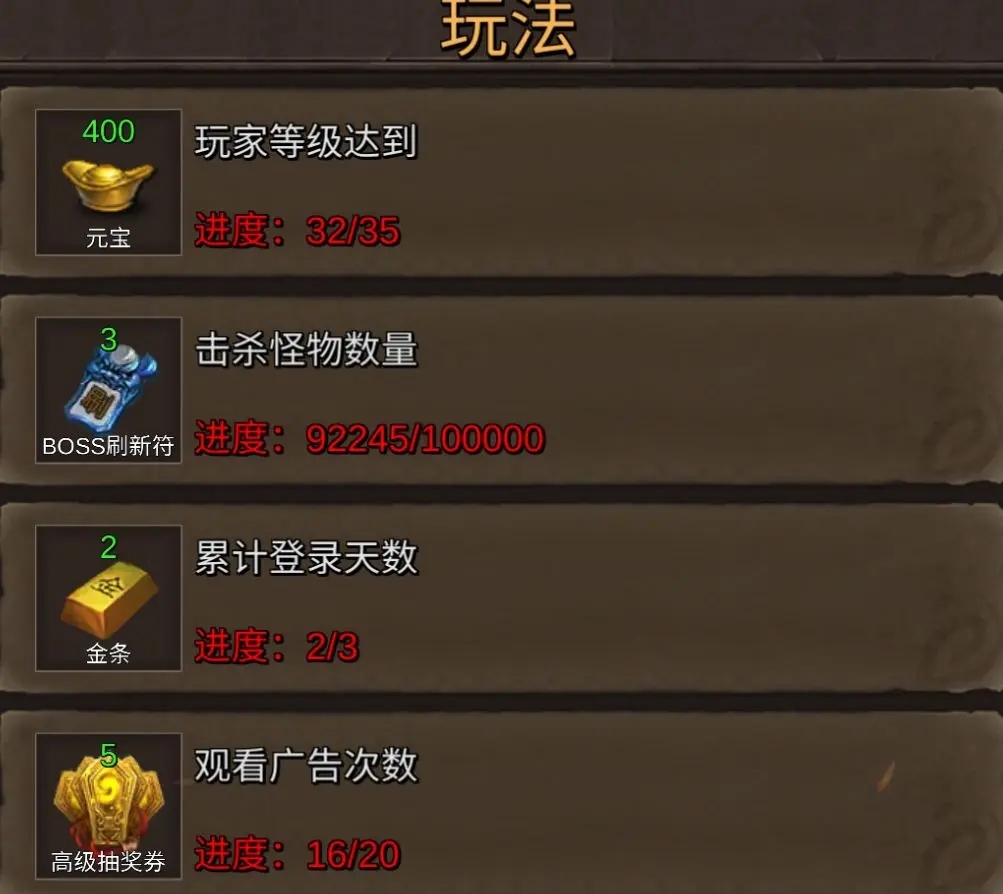 如:暗之牛魔王完成十次任务,累计获取1500元宝及1500000金币