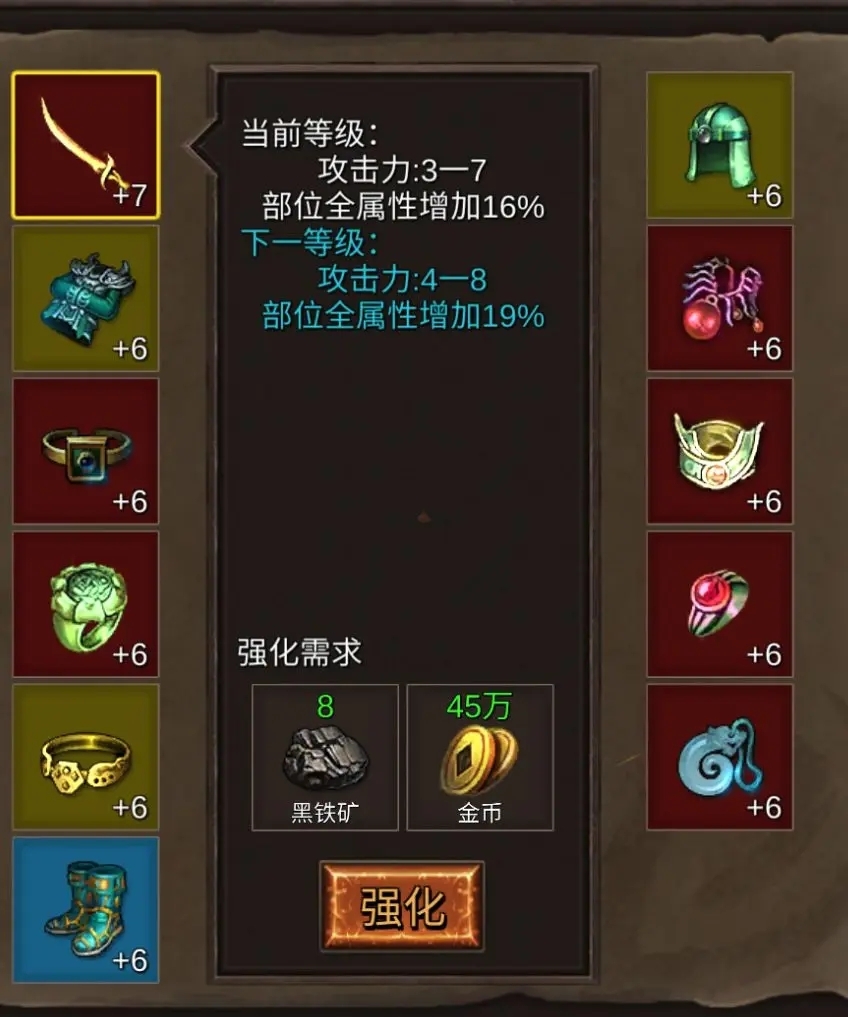 消耗黑铁矿石能够对全身11个部位开展强化操作,进而获得永久性的属性提升。