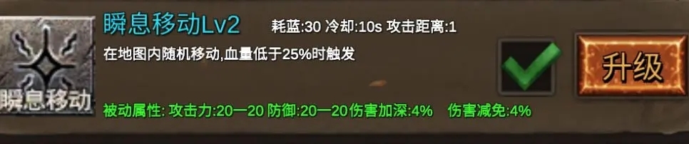 当前这个神技是必学的,被动加成相当高。上面这张图展示的是2级瞬间移动技能,能增加20-20的攻击与防御,同时带有伤害加深和伤害减免的百分比效果。另外它还有个关键功能:当角色血量较低时会随机传送,给玩家使用药品回血的机会,大幅提升了生存概率。