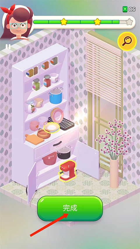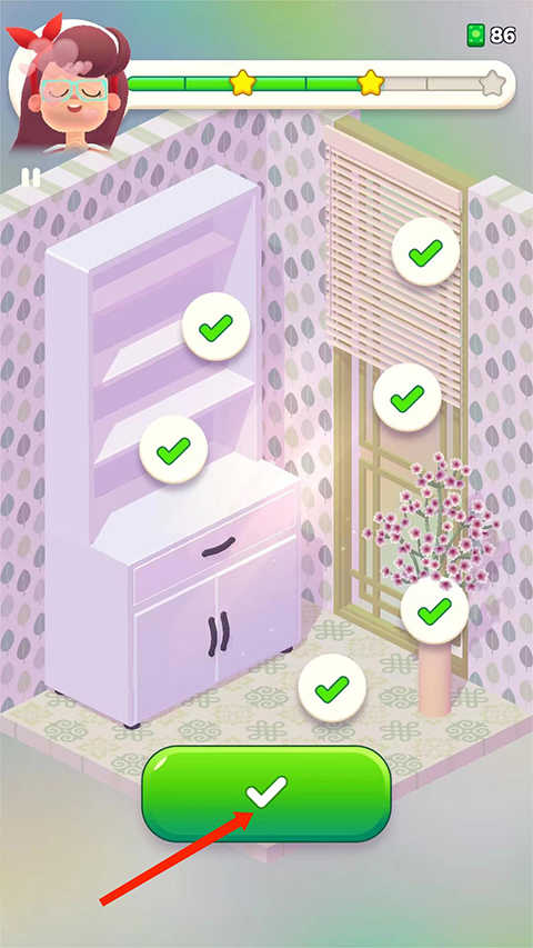 点击【星星】图标,即可查看装修任务的相关提示;当你正确摆放家具后,女主人会给出相应的反馈评价。