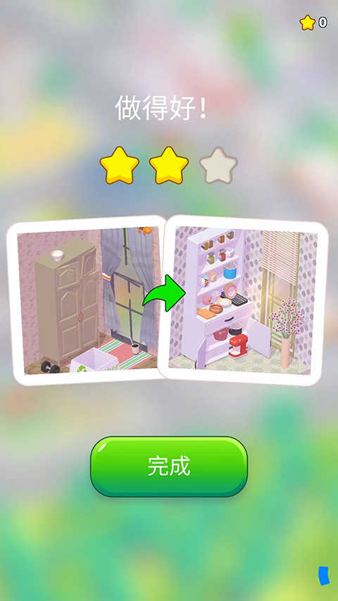所有物品都摆放好之后,点击【完成】按钮,就能查看摆放前后的对比图了。