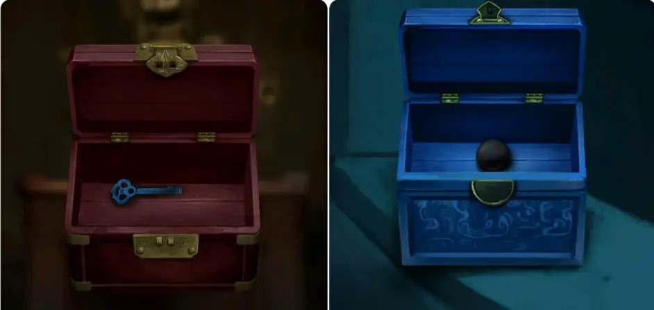 5、回到左二墓室,使用红色钥匙打开雕像嘴里的盒子,获得红色蜡烛和蓝色钥匙。接着前往右一墓室,打开架子上的蓝色盒子,取得黑色棋子。