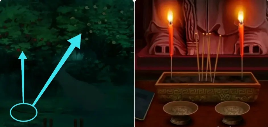 在河的对岸,你先拾起左下角的那根木棍,用它把树上的苹果和梨都够下来。之后,你回到土地庙,将苹果与梨摆到供桌上。随即,你触动了暗道的机关,顺利打开了暗道,就此进入下一章。