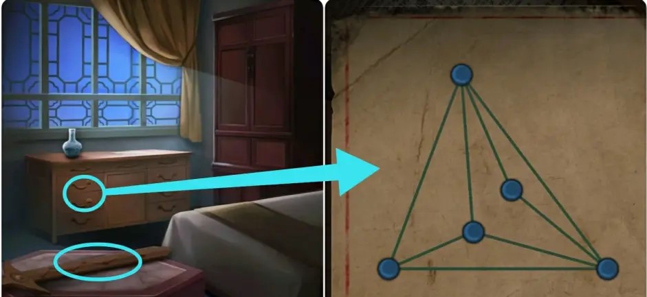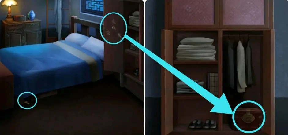 接下来,你步入中庭,用钥匙二开启了右侧厢房的房门。进入房间后,你在床底发现了钥匙三,同时留意到衣柜门上的提示。随后你打开衣柜内的盒子,得到了祖师爷的画像。