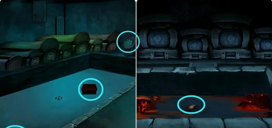 把蓝色钥匙插到左侧墓室的石柱上,等水池里的水干了,就捡起池底的红色钥匙。之后,返回右侧墓室,把钥匙插入石柱,再拿出火池底下的怪石头。