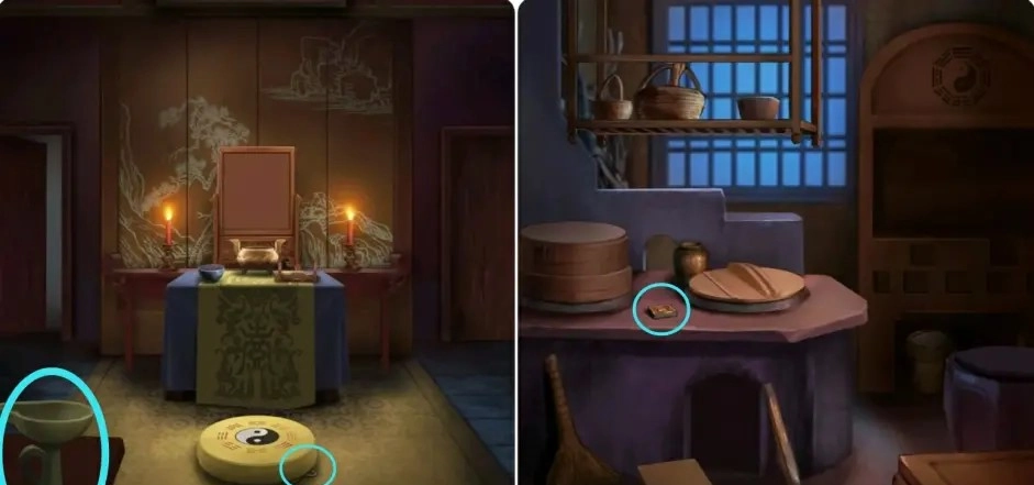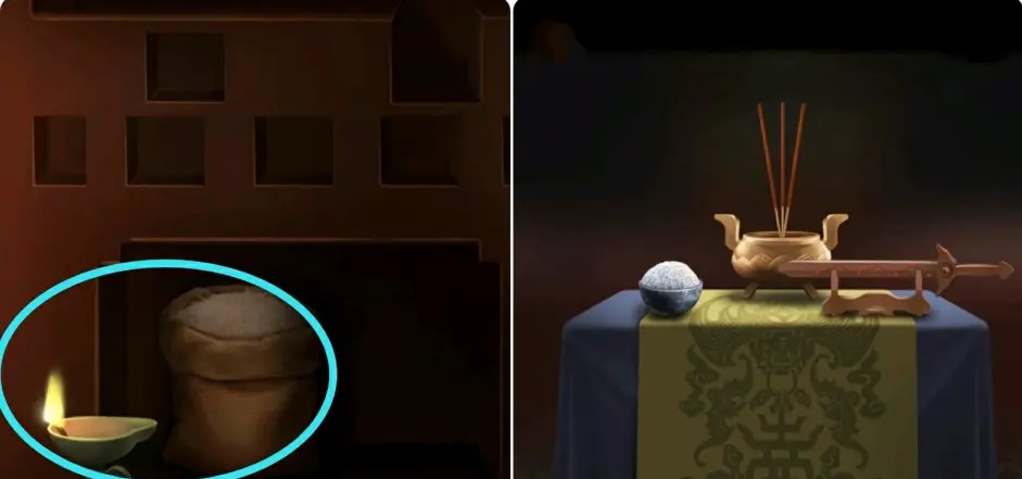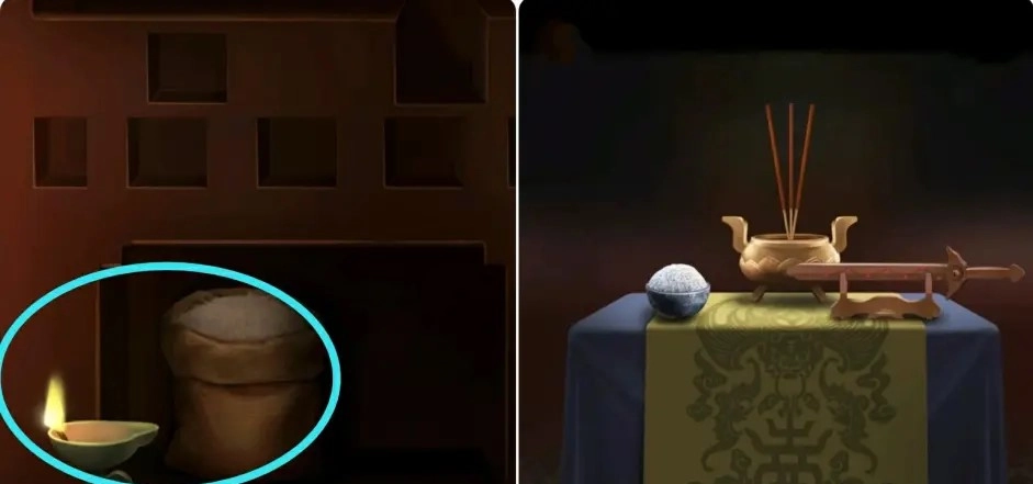 5、回到厨房,你将油灯放在柜子的左下角,然后放上灯芯并用火柴点燃。接着,你拿走了袋子里的糯米,回到了祠堂将收集到的道具放在贡台上,最后挂上祖师爷的画像。在经过剧情动画后,你成功进入了下一章。
