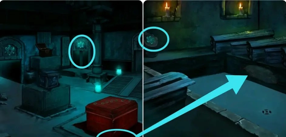 4、用铁钥匙打开右二墓室的门,完成解谜机关,打开暗格里的盒子,获得绿色蜡烛和红色钥匙。