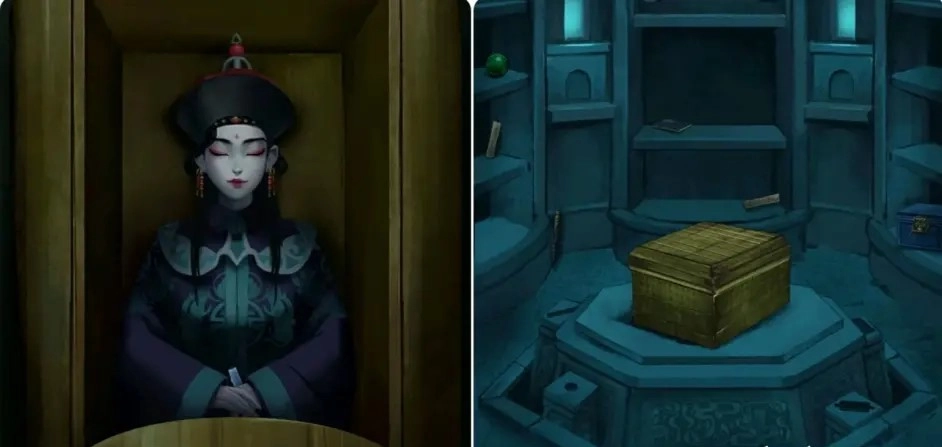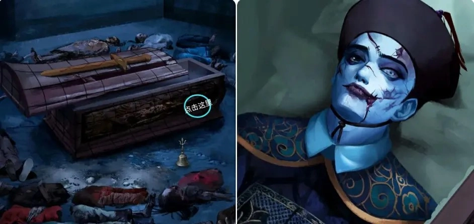 进入左侧墓室后,先打开左边第一个棺材,取出黑色钥匙,同时留意七个棺材上的提示信息。根据这些提示,按三、四、二、四、三、四的顺序操作箱子,即可得到另一把黑色钥匙。