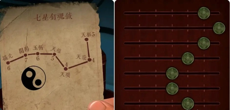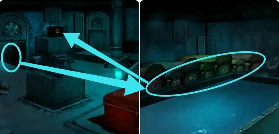 7、使用怪石头打开左侧墓室水池底的箱子,获得七星钉魂阵。观察阵法上的提示,然后打开大厅中的红色箱子,激活暗门并进入下一章。