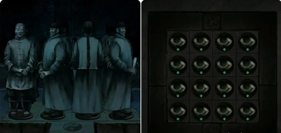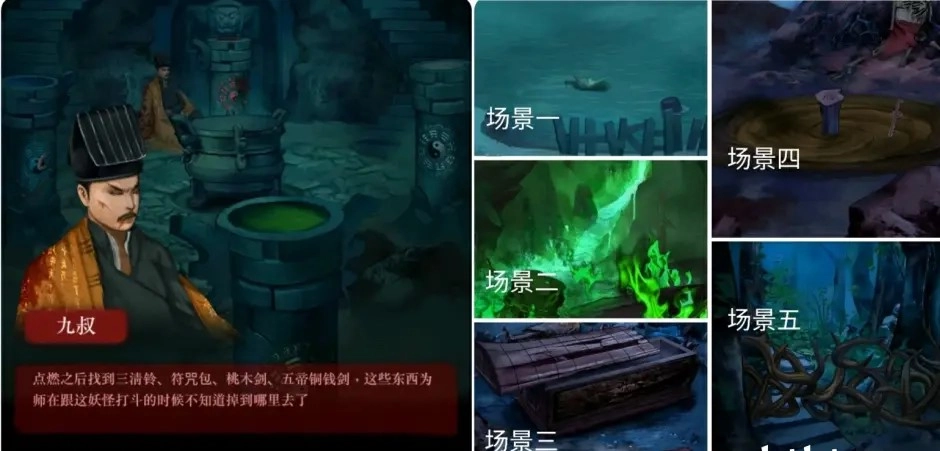 1、你需要找到分散在各处的降妖道具,最终将四圣柱点燃,这是九叔给你的任务。完成任务后,登上楼梯观察门后的五个场景。