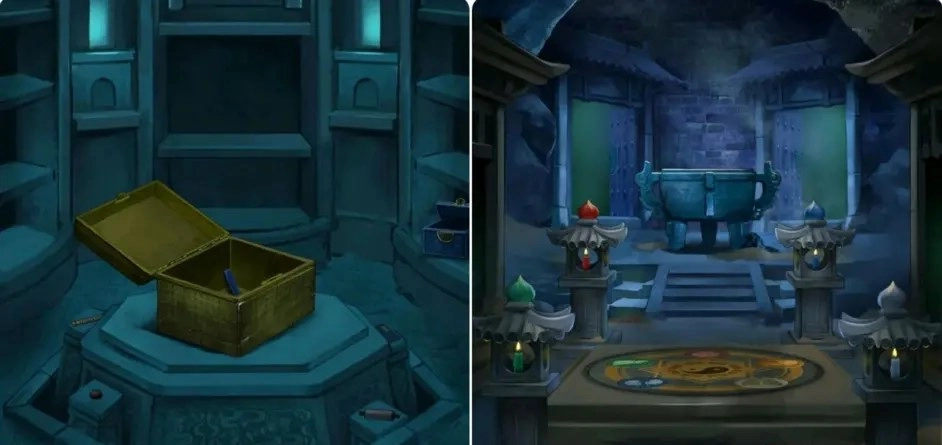 把收集到的卷轴、书、笛子和棋子放进祭坛上对应的凹槽里,打开中间那个黄色的箱子,拿出里面的蓝色蜡烛。之后离开墓室,将四根蜡烛放置到对应颜色的灯座中,再把它们点燃。