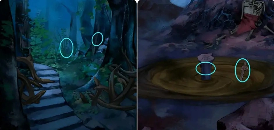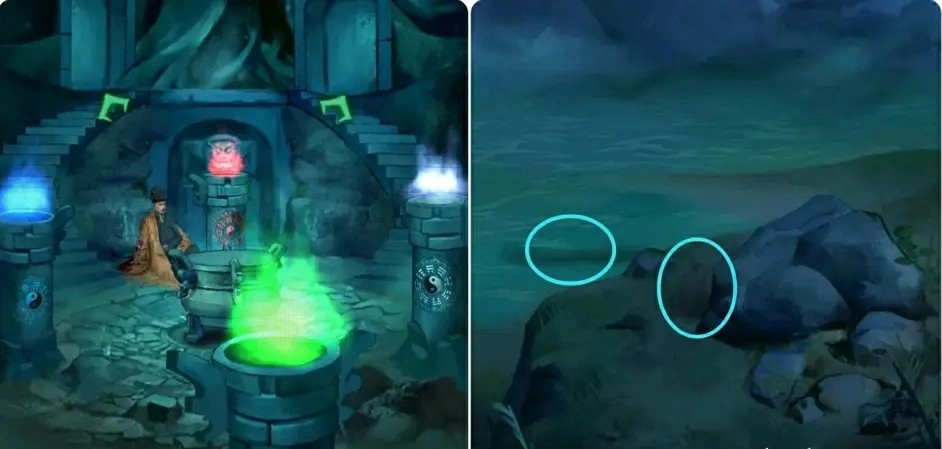 在第二个场景里,戴上厚手套捡起地面上的铁链,随后去九叔那儿把四圣柱点燃。之后,点击第一个场景中的木船,乘船前往河中央的石滩,找到乱石背后的符咒包并拿起来。最后,借助铁链从河里将铁剑捞起来。