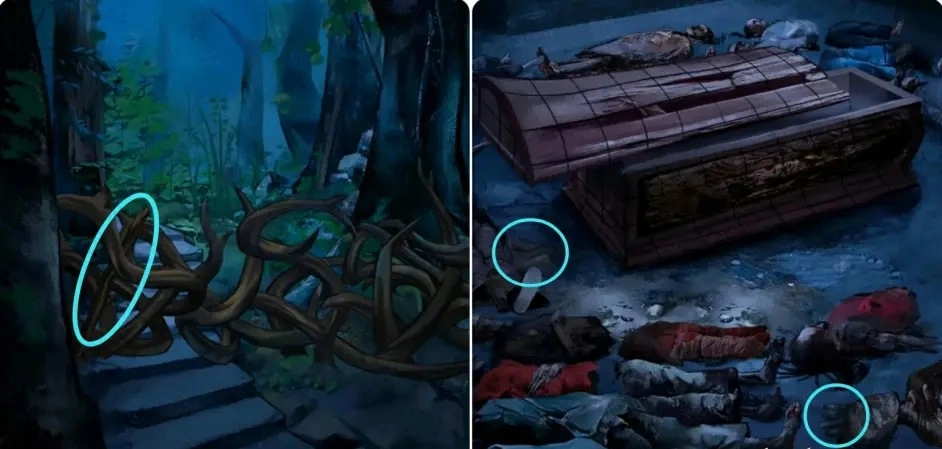 3、将破布放在棺材左下方的地面上,沾上尸油,然后用枯木棍进行组合,制作出尸油火把。用火把点燃场景二的火炬。