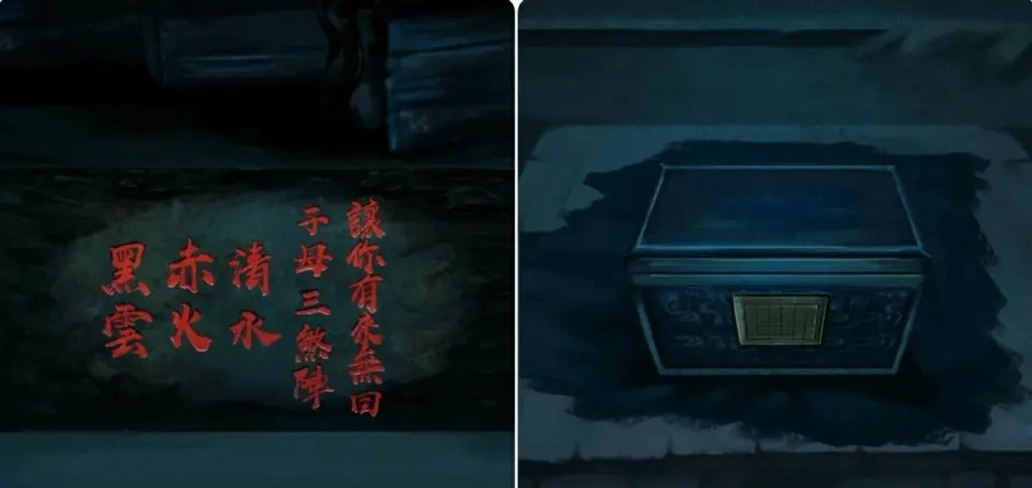 4、观察池壁上的提示,包括黑、赤、清、云、火和水,这是子母三煞阵的提示。然后退出墓室,打开黑色箱子,获得红色钥匙。接着,使用红色钥匙打开右侧的墓门,准备阵法。