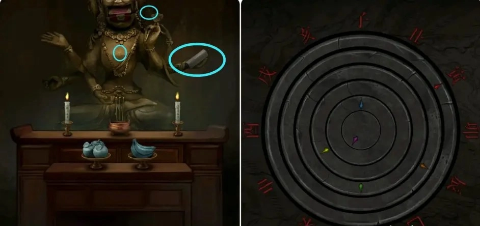 3、用绿色珠子打开左二墓室的门,进入墓室后将蜡烛、香和贡品放在贡台上并点燃,完成后取走雕像手中的卷轴。然后观察雕像胸口和背后的时辰提示,并根据墓室各处的时辰寅辰午申亥未打开供桌下的箱子,获得铁钥匙。