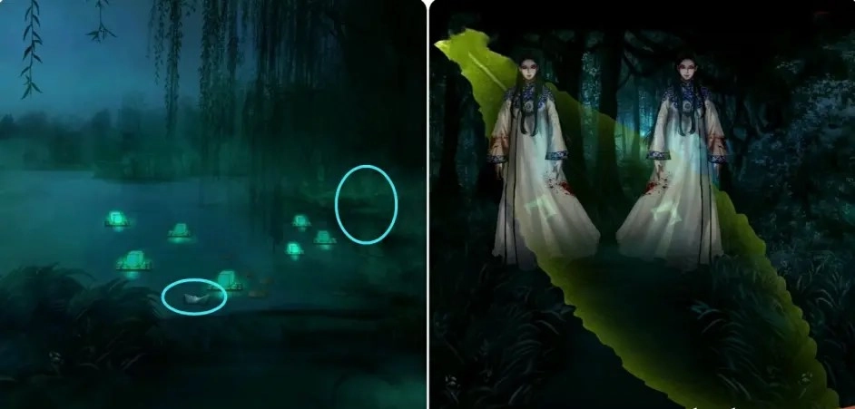 你抵达石碑所在之处,先往右侧走去,取走河里的小白船以及旁边柳树上的柳树叶,随后退回原处,点击左上方的方向键(任意选择一个)前往下一段山路,接着用柳树叶展开观察。