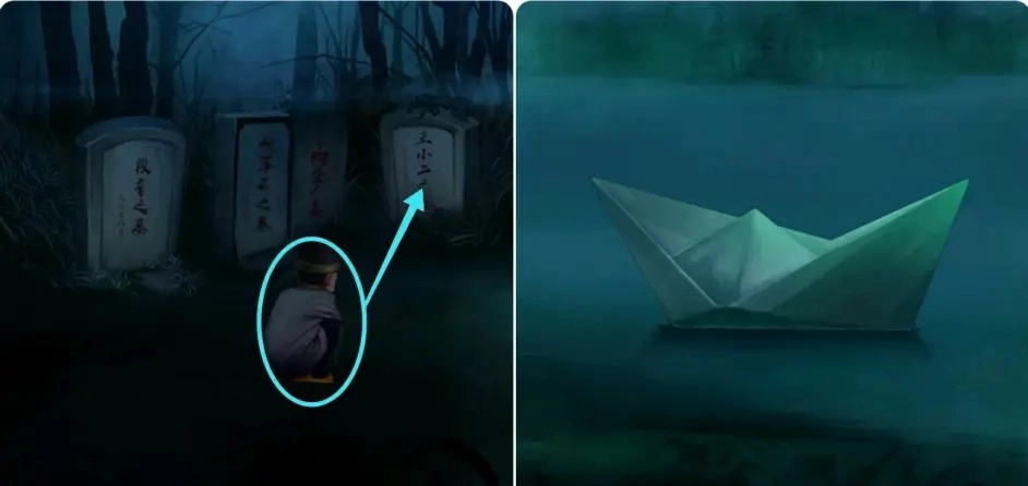 3、来到了土地庙右侧的坟地,遇见了小孩鬼魂。你先使用引魂符,然后点击王小二的墓碑,使其归魂。随后,你拿走了压在地上的巨化符。接着,你回到了山路处,使用柳树叶走左侧到河边,将小白船放进河里,并使用巨化符。点击巨化后的小白船,你来到了河的对岸。
